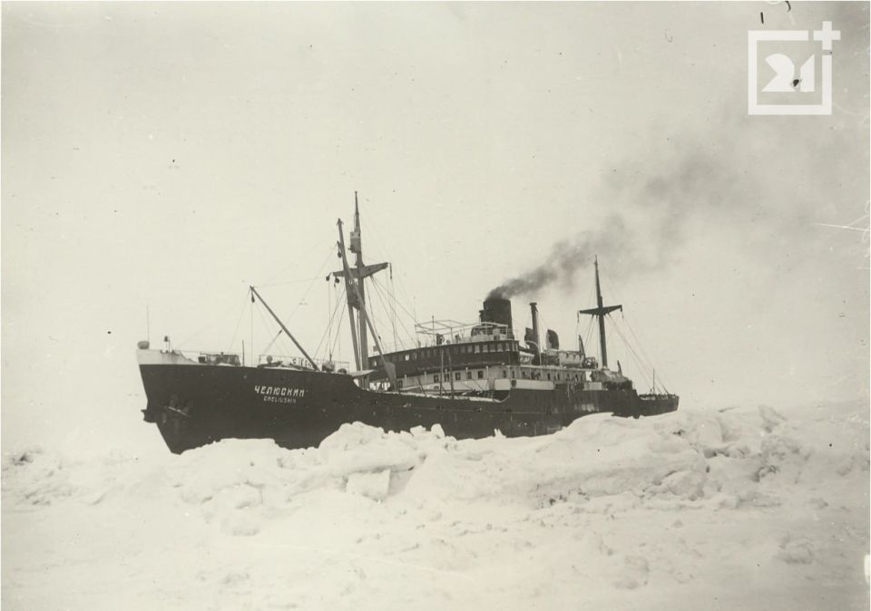 «10 августа 1933 года в 4.30 «Челюскин» снялся с якоря и взял курс на Баренцево море. «Все возбуждены, как перед боем…» 12 августа в 20.00 экспедиция вошла в пролив Маточкин Шар. Температура воздуха +3 градуса. У мыса Лагерный, где были видны четыре барака с антеннами и строящийся большой деревянный дом, поравнялись с лесовозом «Аркос».На траверзе парохода «Аркос» бросаем якорь. Будем высаживать «зайца». «Заяц» – молодой, 22-летний парень – залез на корабль в Мурманске и два дня прятался в угольной яме. На третий – вылез и представился: «энтузиаст Арктики», желает идти с нами до победного конца.