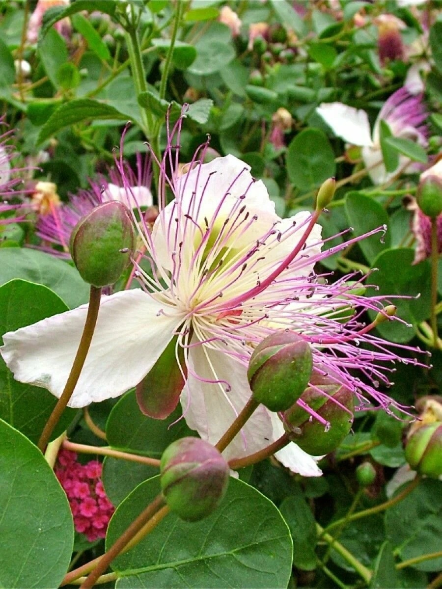 Каперсы колючие (Capparis spinosa) — один из самых стойких видов растений Средиземноморья. Они прекрасно растут в самых неблагоприятных условиях — на скалистых обрывах или на вулканическом пепле. Тонкие корни находят микротрещины, проникают в них и разрастаются, добывая влагу из, казалось бы, бесплодной земли. Растение образует стелющиеся побеги с мясистыми листьями, отражающими солнечный свет. И когда бутоны распускаются, их белые лепестки и пурпурные тычинки создают невероятное зрелище. Однако этот мимолетный момент делает их уязвимыми: растерять время — значит потерять возможность собрать урожай.