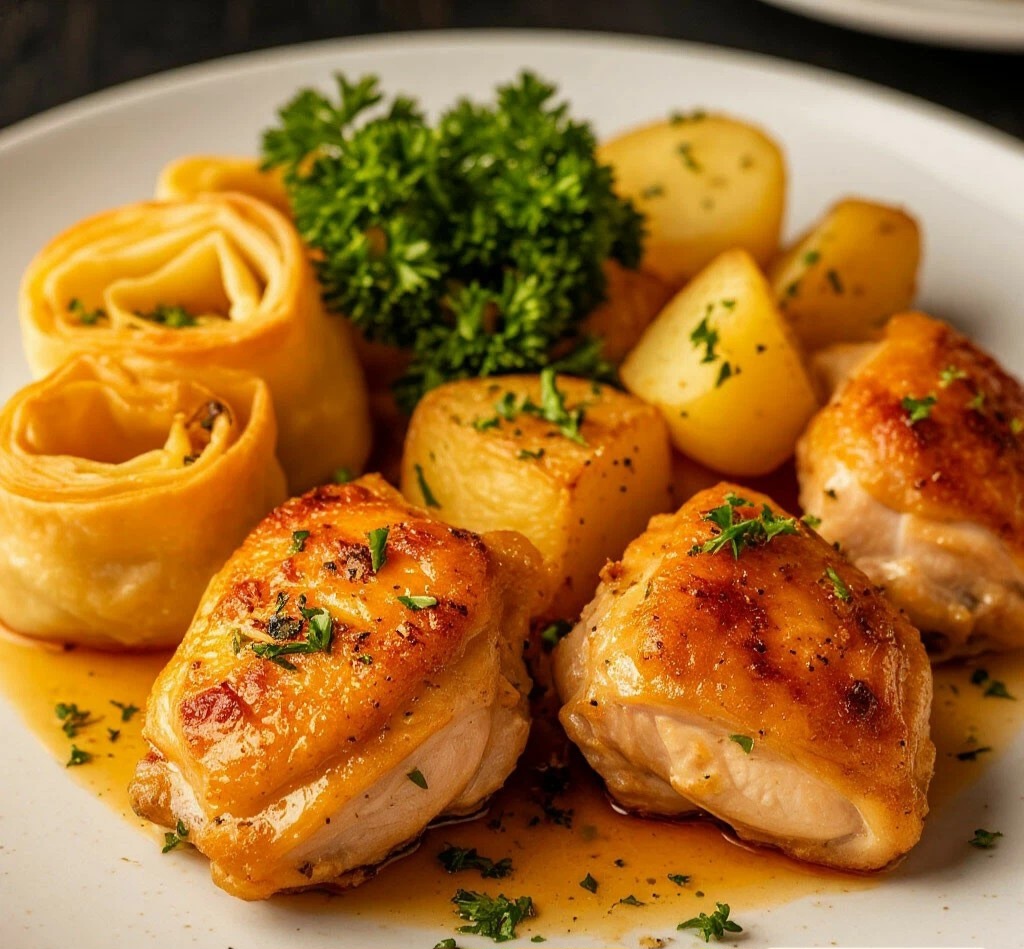 На готовое блюдо перед подачей можно посыпать свежей зеленью и черным перцем для дополнительного аромата. Это сочетание куриного мяса, пропитанного соком картофеля и аппетитными штруделями, станет настоящим хитом вашего стола!