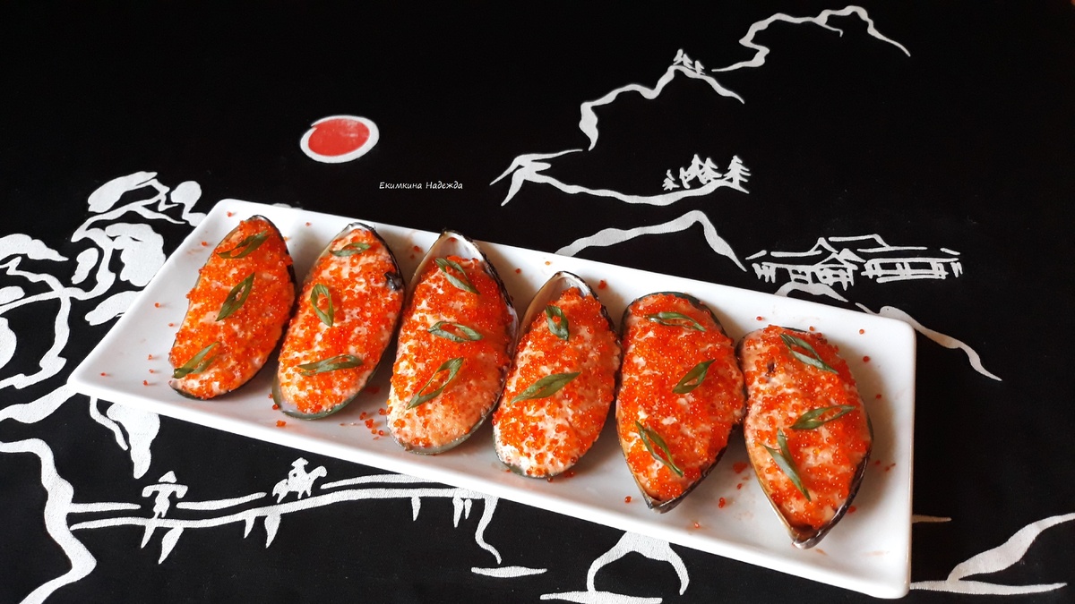 После запекания мидии необходимо слегка украсить икрой, выложить на подающее блюдо и присыпать кольцами зеленого лука. Блюдо подается горячим, что подчеркивает его изысканный вкус.
