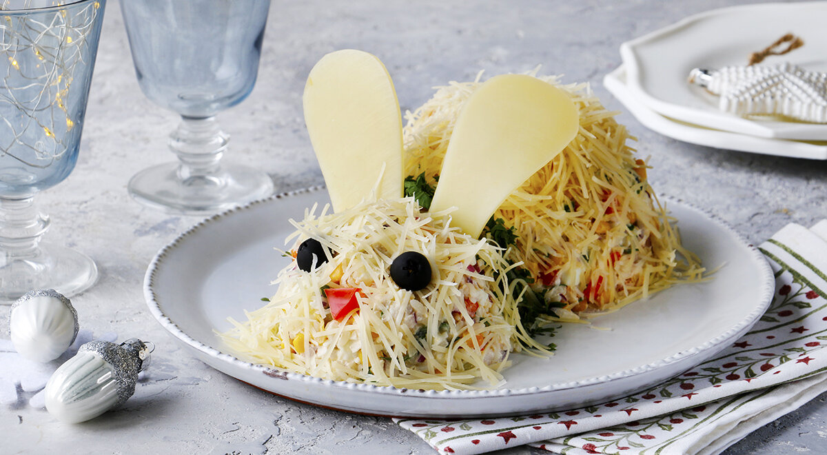 Вкус этого салата не оставит равнодушными ни взрослых, ни детей. Сочетание куриного филе, риса, кукурузы и сыра создает гармоничный букет вкусов. Форма в виде кролика, несомненно, привлечет внимание детей и сделает процесс приготовления веселым совместным занятием.