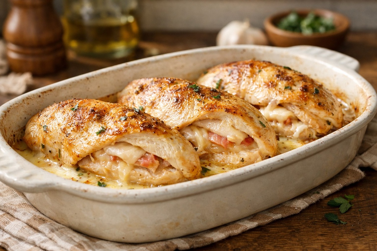 В этом рецепте cочетается нежное куриное филе, мягкая моцарелла и крабовые палочки, пропитанные сливочным соусом. Обжаривание куриного мяса на сковороде перед запеканием создает аппетитную золотистую корочку и сохраняет сок внутри.