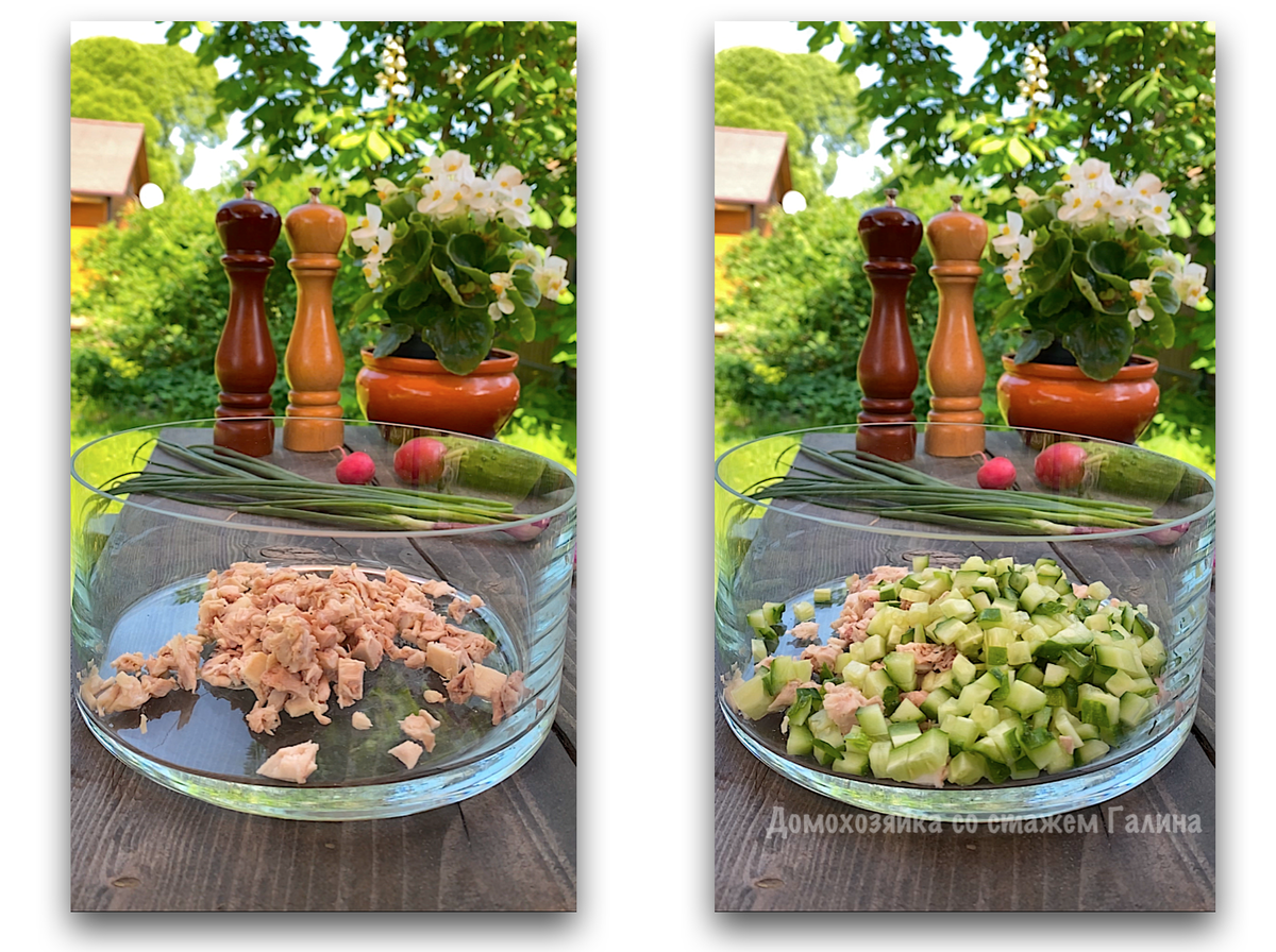 Для приготовления окрошки можно использовать как натертые, так и нарезанные продукты. В этом случае вареную курицу нарезают кусочками, добавляют свежие огурцы, редис, укроп и зеленый лук в одну миску. Если хотите, можно добавить вареный картофель, а чтобы усилить вкус — немного каперсов и горчицы. Затем все это смешивается с кефиром и газированной водой.