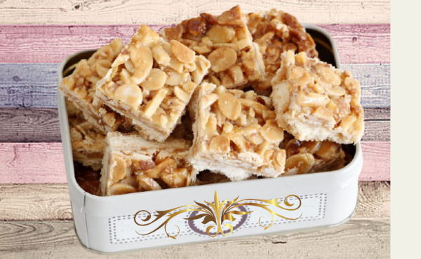 Разогрейте духовку до 170°C. Смешайте все ингредиенты для теста и выложите на противень. Выпекайте 10-15 минут до золотистого цвета. Затем приготовьте карамель, смешав сахар, воду и мед. Добавьте сливки и перемешайте. Смешайте с миндальными лепестками и равномерно выложите на печенье, вновь запекайте еще 10-15 минут. После остывания нарезайте и наслаждайтесь!