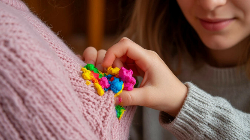 История, произошедшая с одной мамой, напоминает сцену из комедии: ее маленький художник, увлеченный творчеством, внезапно обнял родителя, оставив на любимой кофточке следы от пластилина. Сразу возник вопрос: как справиться с этой накладкой?