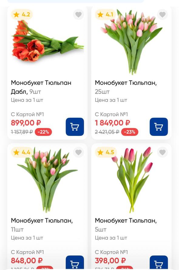 Еще из бюджетных вариантов – покупка цветов в продуктовых магазинах, например, в крупных гипермаркетах. Там букеты стартуют от 398 рублей – это цена за 5 тюльпанов.