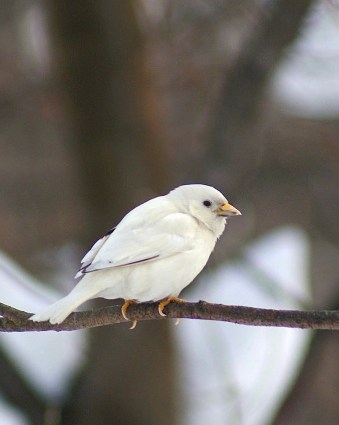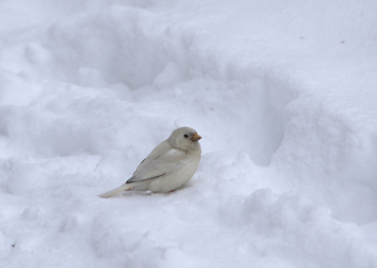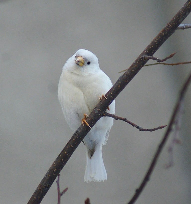 В Мурманске на набережной у дома престарелых заметили необычного белого воробья. Птица живет в этом районе уже около года – впервые ее увидели прошлой осенью, но тогда удалось сделать лишь размытые снимки. Такой окрас связан с редкой особенностью пигментации. Птичка уже получила прозвища – Беляшик и Полярный воробей