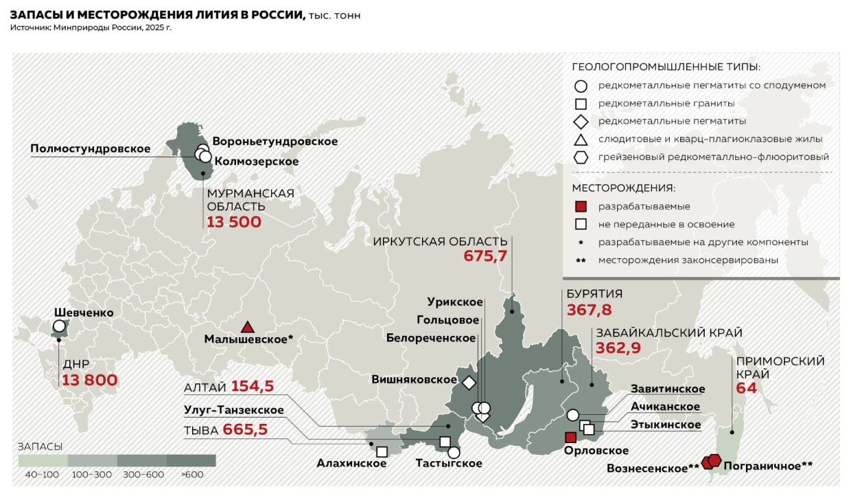 На 2025 год государственный учет утверждает наличие лития в рудах в 17-ти отечественных месторождений. Только в 14-ти из них утверждены запасы в объеме 3,5 миллиона тонн. Еще на 3-х объектах прогнозные ресурсы оцениваются примерно еще в 1 миллион тонн.