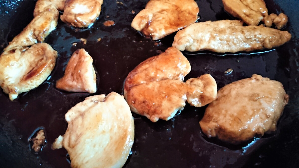 Когда курица подрумянится, влейте соевый соус и добавьте сахар, тщательно перемешивая, чтобы мясо покрылось аппетитной глазурью. После этого можно выключить огонь и оставить курицу на сковороде.