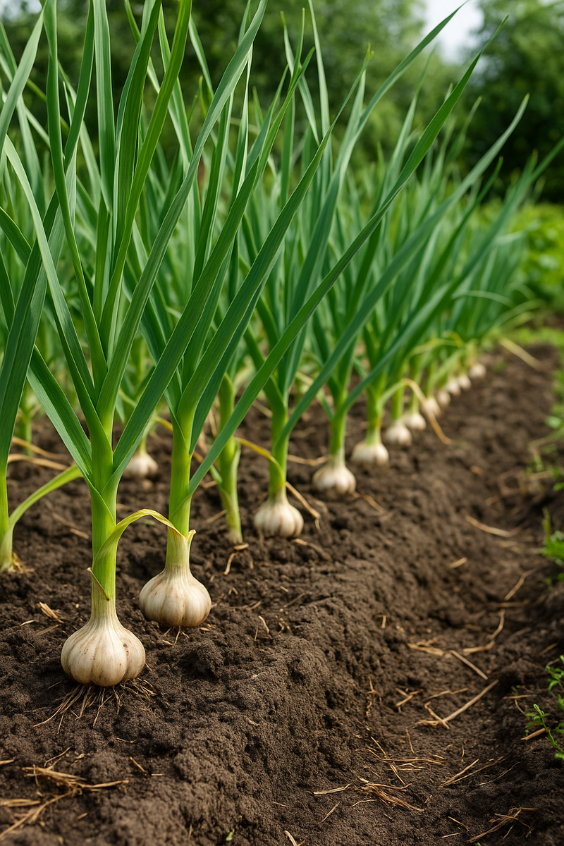 - Полив и прореживание: Чеснок очень любит влагу, особенно во время активного роста, но важно избегать избыточного полива. Если растения слишком густо растут, стоит оставить только сильные ростки.