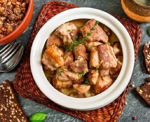 На сковороде (идеально подойдет вок) разогревается растительное масло, в которое обжариваются куски свинины до образования золотистой корочки. Обжаренную свинину переложить в горшок для запекания, а на оставшемся масле обжарить нарезанный лук. Если планируется добавление грибов, их следует жарить вместе с луком.