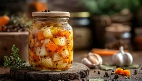 3. Затем готовят маринад, смешивая воду с солью, сахаром, уксусом, растительным маслом, лавровым листом и перцем. В маринад добавляют натертую морковь и кориандр.