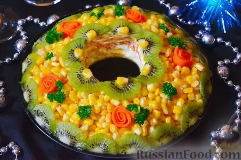 - Салат с курицей, кукурузой и киви: Этот слоеный салат легко готовится из отварной куриной грудки, натертой моркови, яиц, консервированной кукурузы и сыра. Яркие ломтики киви придают ему не только свежесть, но и праздничный вид.