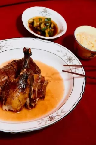 Запеченный гусь удивляет своим внешним видом, который напоминает утку по-пекински: тонкая хрустящая корочка и нежное мясо внутри. Кулинарный процесс включает в себя 24-часовую маринацию, после чего гусь выдерживается в смеси специй и обрабатывается ферментированным красным рисом для придания характерного цвета. На стол гусь подается с рисом и битыми огурцами, что делает блюдо еще более аппетитным.