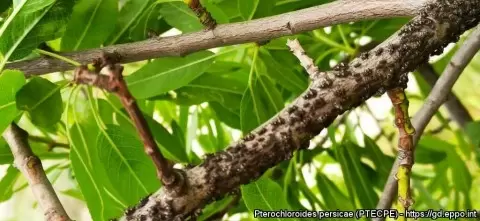 Зимовка: В регионах с холодными зимами тля зимует в виде яиц, которые можно найти в коре, ветвях и старых ранах. На юге возможен круглогодичный цикл.