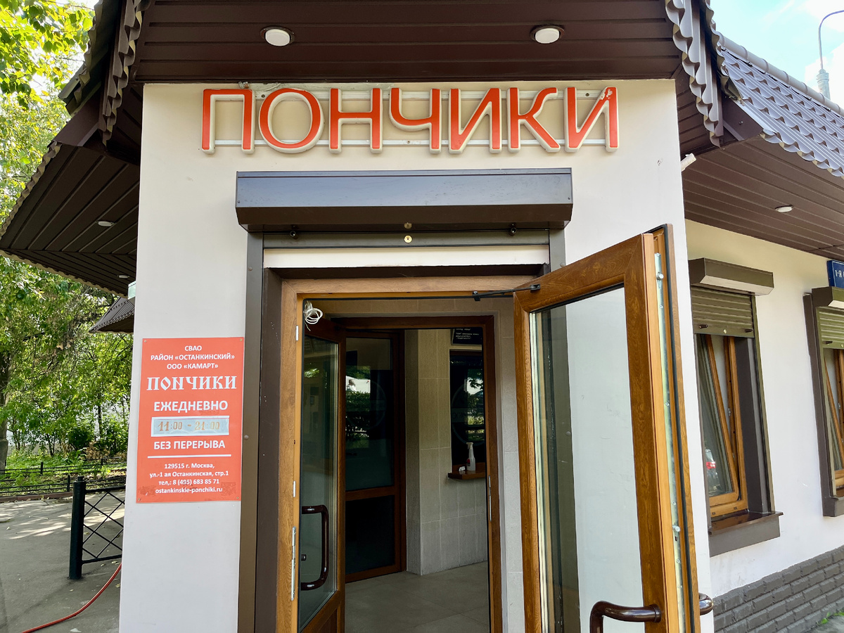 Легендарный павильон «Пончики» расположен недалеко от Останкинского пруда и Телецентра. Это заведение отличается от множества новых киосков с пончиками на ВДНХ — здесь сохраняются традиции с 1953 года. Пончики продаются на вес по цене 60 рублей за 100 граммов. Работает с 11:00 до 19:00, но стоит помнить, что желающих попробовать это лакомство может быть много, так что подготовьтесь к очереди.