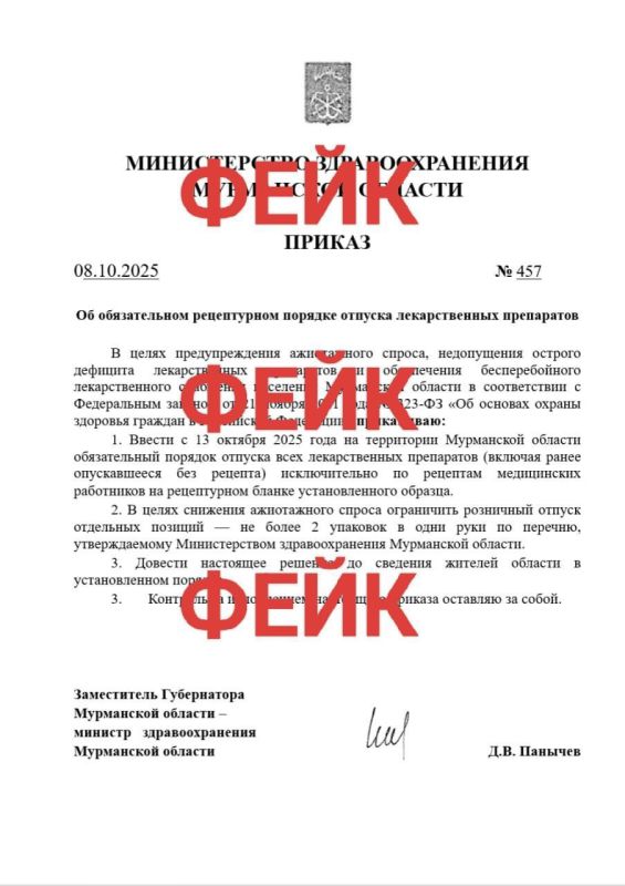 В соцсетях начали активно делиться поддельным приказом, якобы подписанным региональным Минздравом. В документе говорится, что с 13 октября в Мурманской области все лекарства будут отпускаться только по рецептам.На самом деле это фейк – никаких решений...